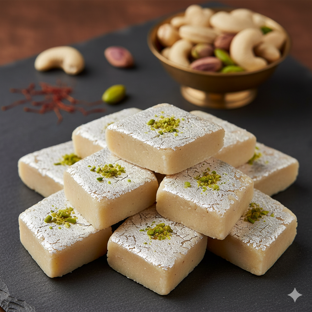 Delicate diamond-shaped delights made from the finest cashews and pure ghee.